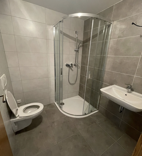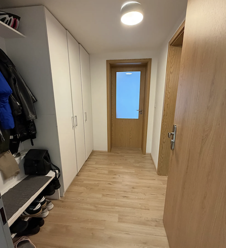 Kuchyňská linka je vybavena vestavěnou troubou, sklokeramickou varnou deskou, digestoří a volně stojící lednicí s mrazákem. V předsíni je praktická skříň s věšákem a botníkem. Koupelna je vybavena sprchovým koutem a toaletou. Byt je jinak nevybavený, k dispozici jsou pouze vestavěné skříně a kuchyňská linka.