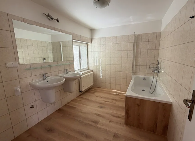Součástí bytu je nová kuchyňská linka vybavená spotřebiči, konkrétně myčka nádobí, indukční varná deska, horkovzdušná trouba a lednice s mrazákem. Koupelna je prostorná, s vanou doplněnou sprchovou zástěnou a dvěma umyvadly, toaleta je oddělená.