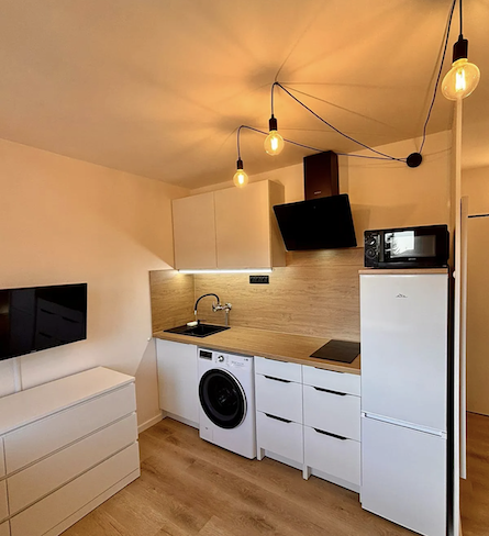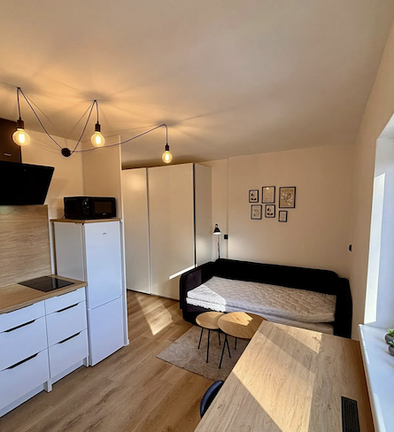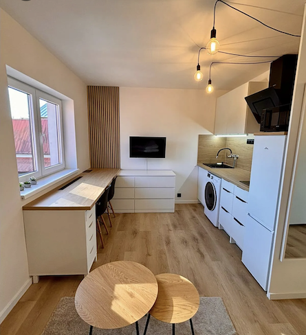 Dispozice je řešena prakticky s důrazem na využití prostoru. Kuchyňský kout má moderní linku na míru, k dispozici je lednice s mrazákem, mikrovlnná trouba, varná deska a také pračka se sušičkou. Obytná část nabízí rozkládací pohovku vhodnou pro každodenní spaní i pro dvě osoby, dále stůl pro dvě osoby, televizi a úložné prostory. V chodbě jsou vestavěné skříně s velkou kapacitou. Koupelna je řešena v designovém stylu se sprchovým koutem a moderními černými prvky.