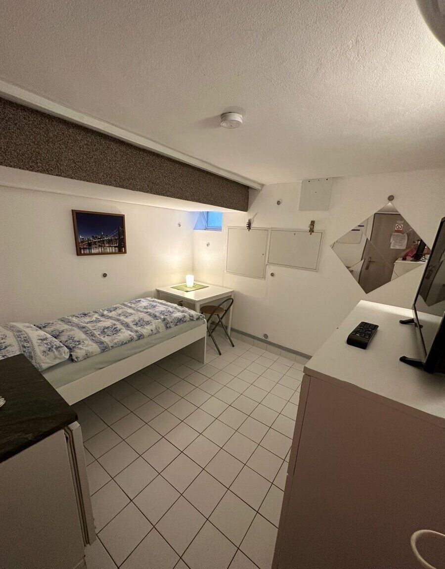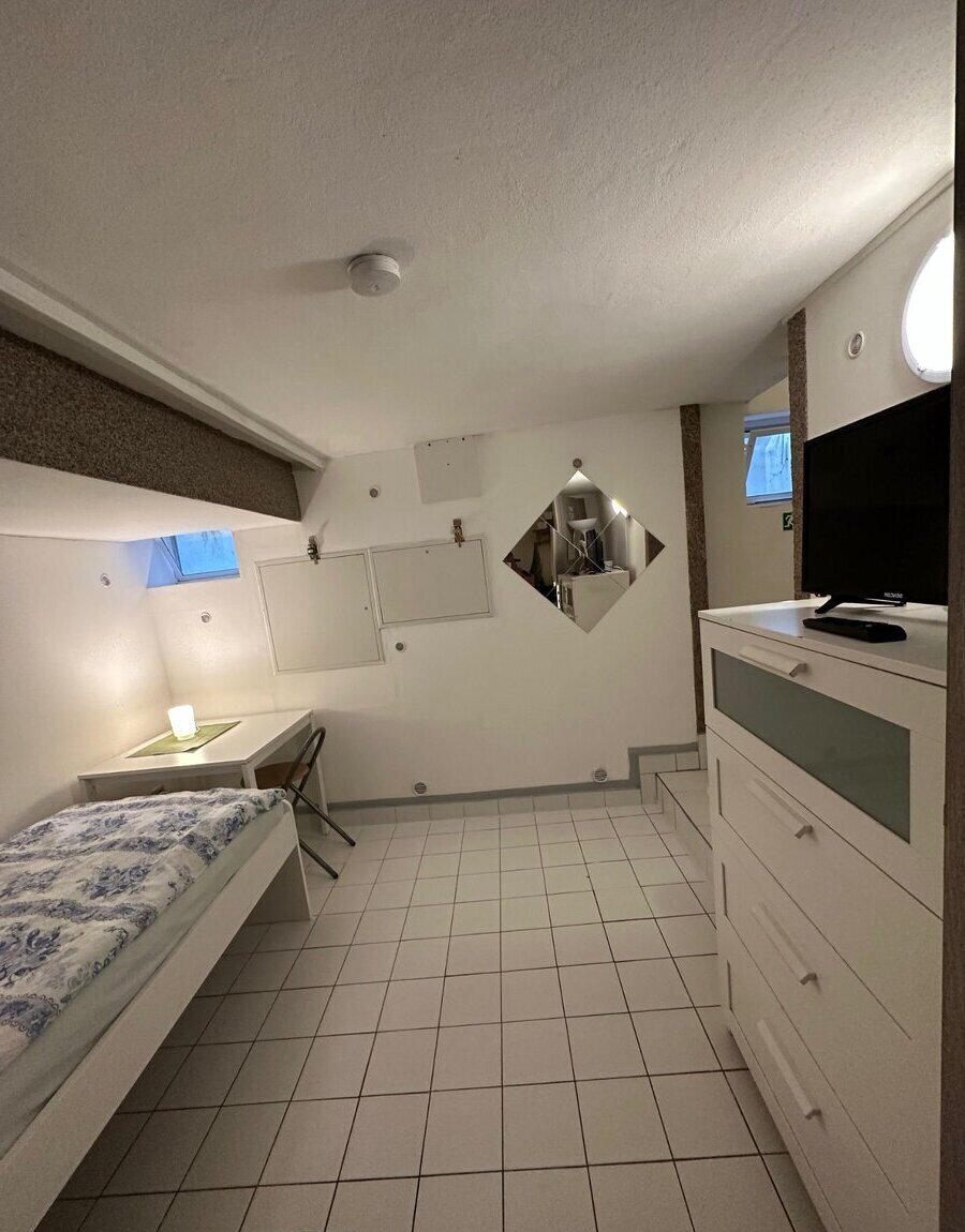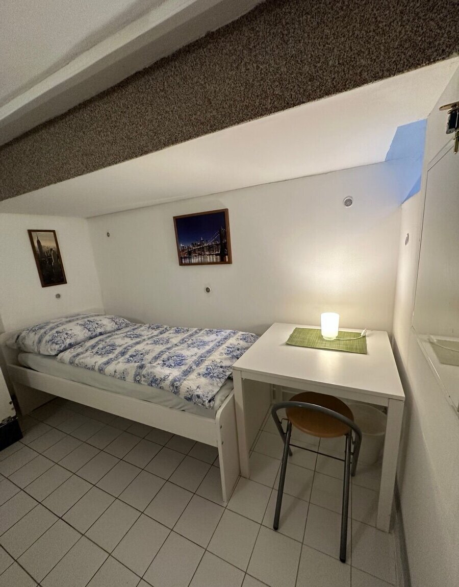 Samostatný pokoj: postel, stůl, židle, skříň, lednice s mrazákem, mikrovlnná trouba, TV, rychlovarná konvice, střešní okna.