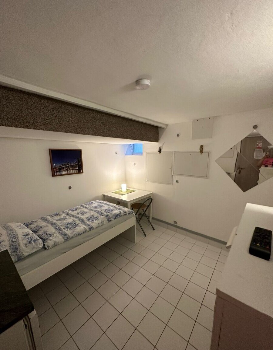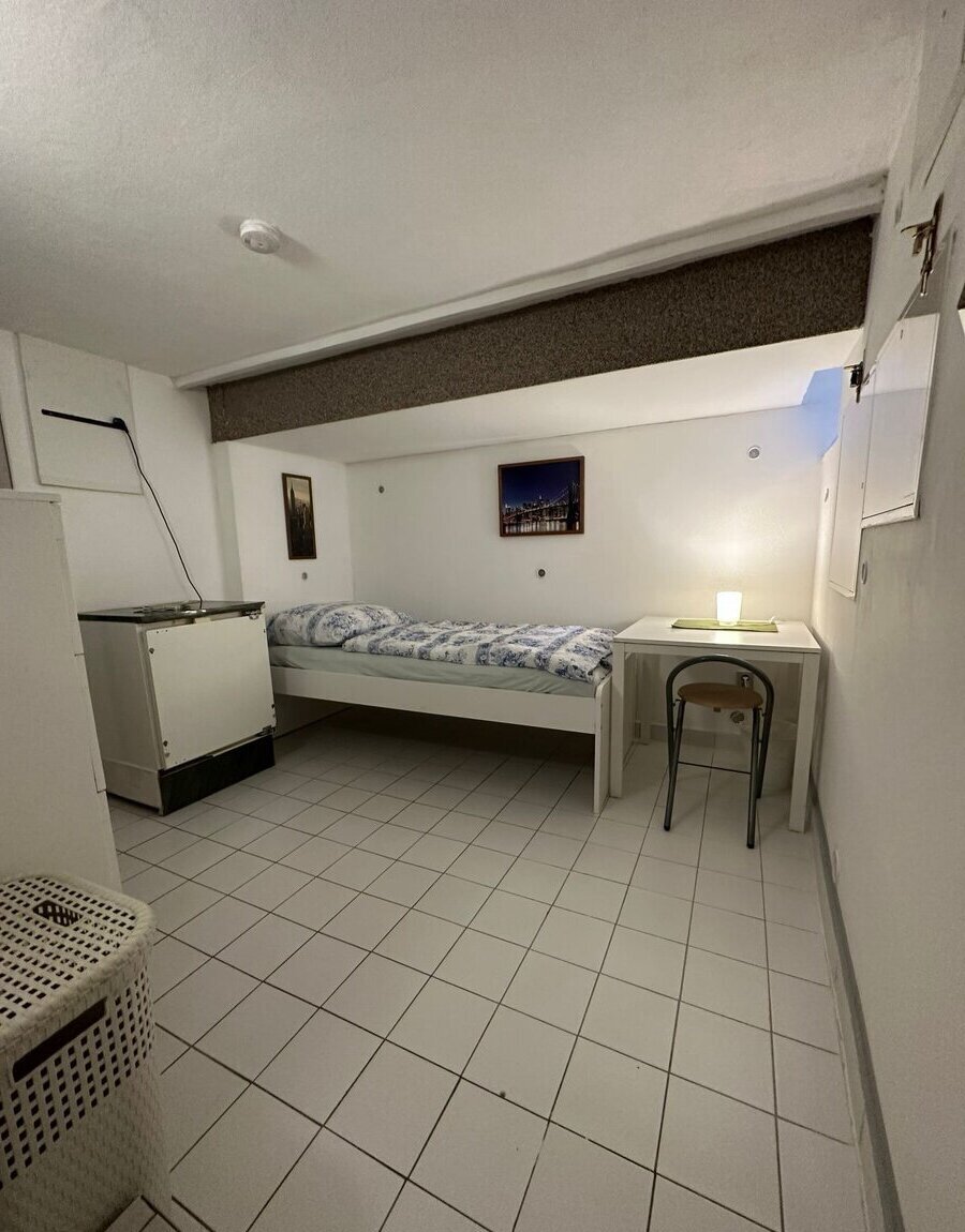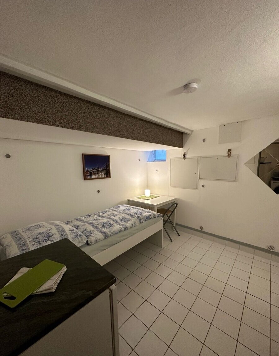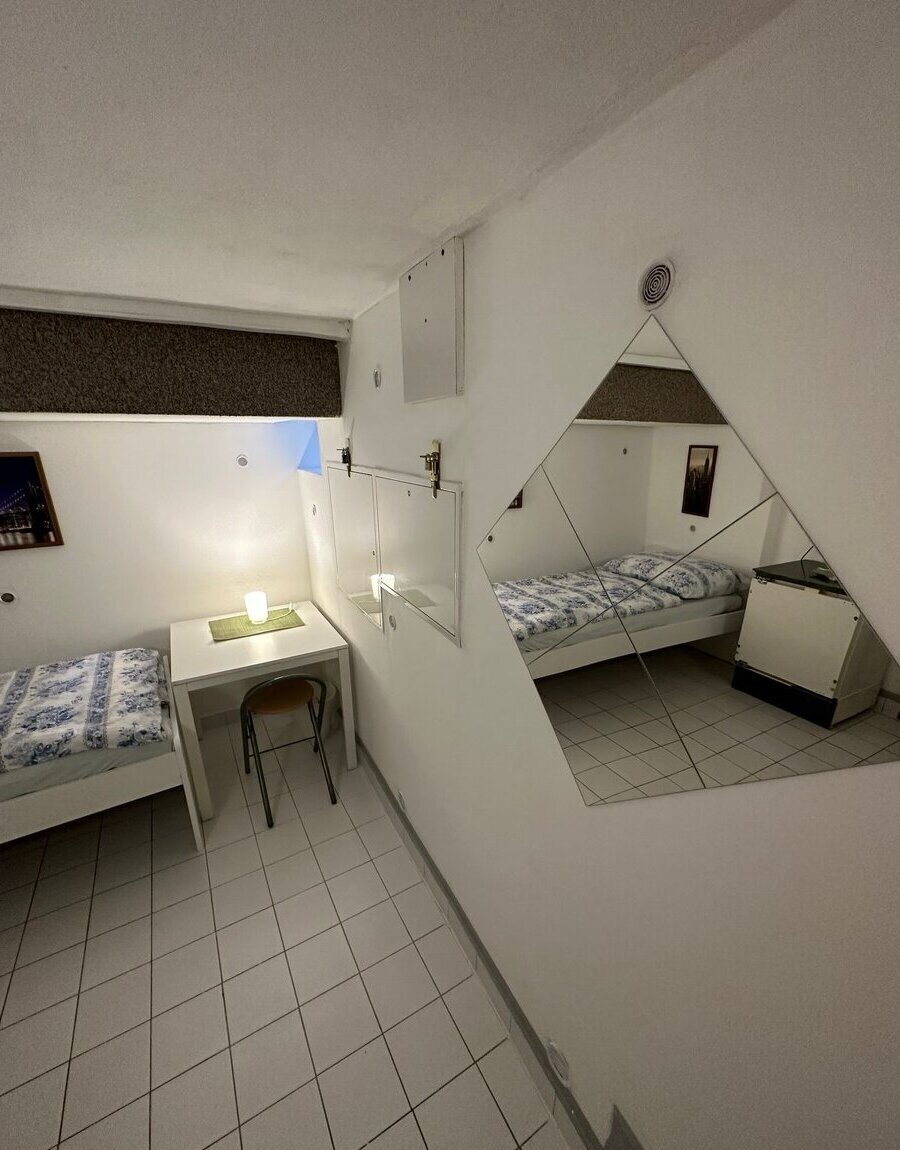 Samostatný pokoj: postel, stůl, židle, skříň, lednice s mrazákem, mikrovlnná trouba, TV, rychlovarná konvice, střešní okna.