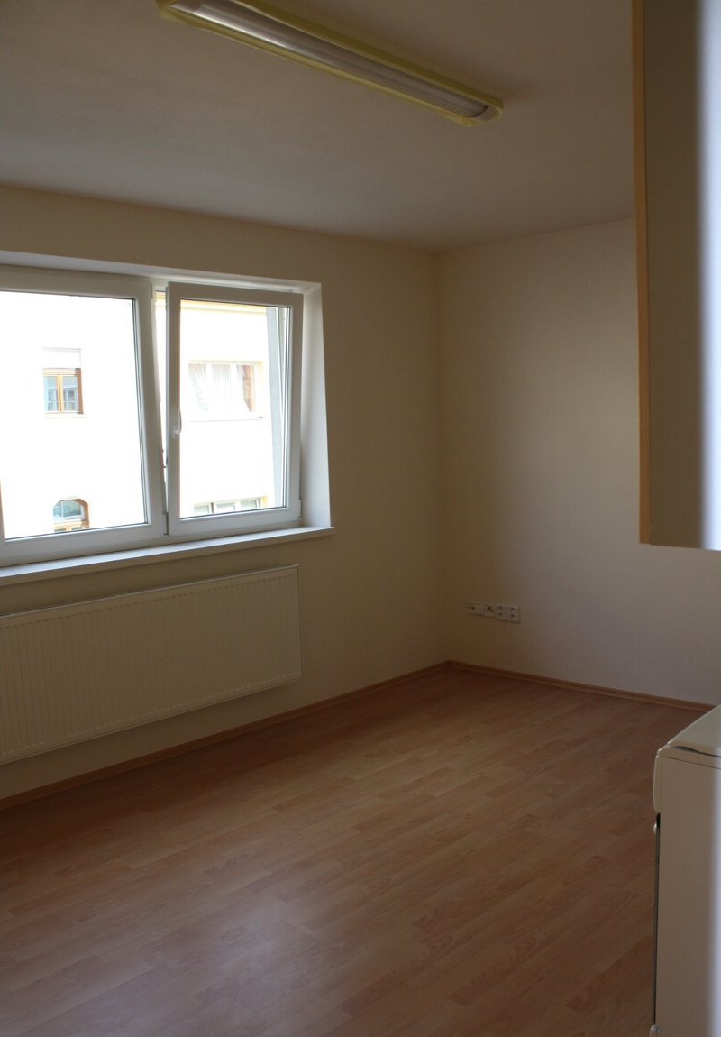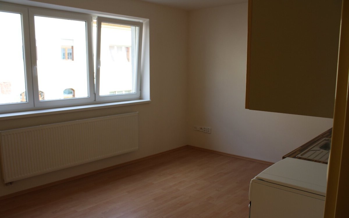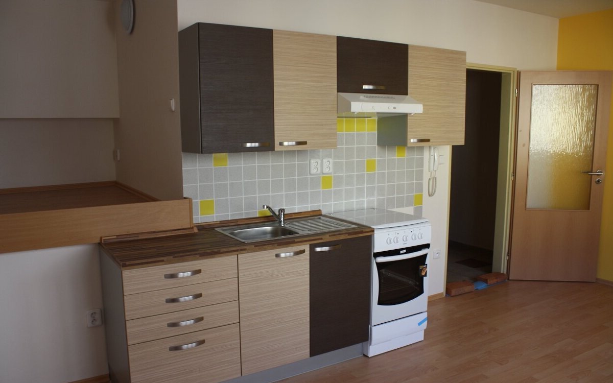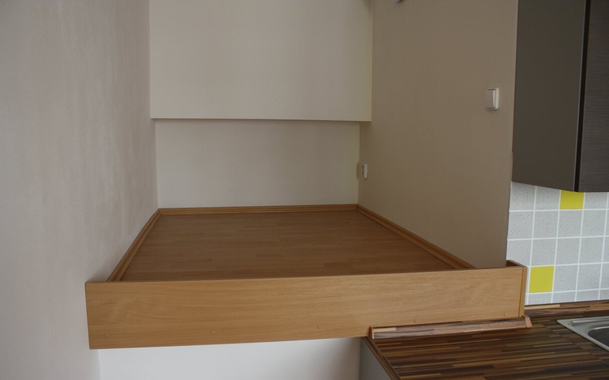 Nabízím k pronájmu nezařízený byt 1+kk s vyvýšeným spaním („pec“). Spací plocha 140×200 cm je přístupná dvěma schůdky a odpovídá zhruba 1,5 lůžku – postel není potřeba, stačí matrace daného rozměru. Místo na spaní lze oddělit žaluzií či roletou. Obytná kuchyň je vybavena pouze kuchyňskou linkou a sporákem, přípojka na pračku je v předsíni.