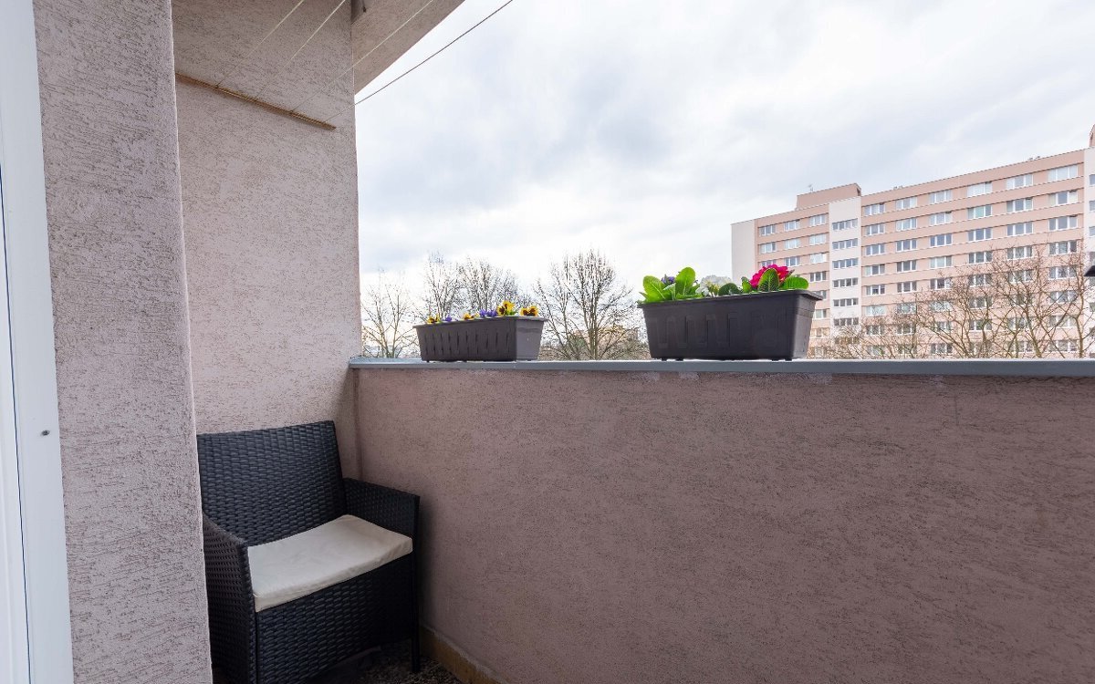 Byt je ve 4. patře z 11 – ideální výška pro pěkné výhledy i příjemný kontakt s okolím. K bytu náleží prostorná lodžie (4 m²) ideální na ranní kávu v soukromí. Samozřejmostí je také sklep pro sezónní věci či kola.