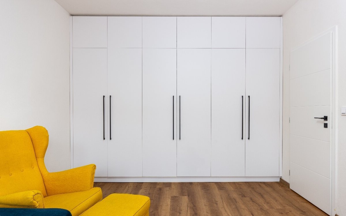V obývacím pokoji je kvalitní vestavná skříň od truhláře, která maximálně využívá dostupný prostor.