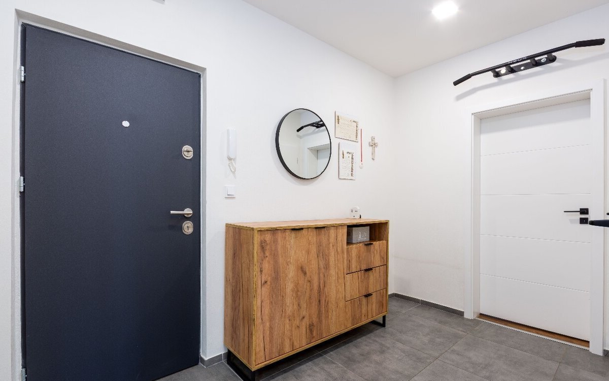 Vstup zajišťují masivní bezpečnostní a protihlukové dveře pro tiché a nerušené bydlení.