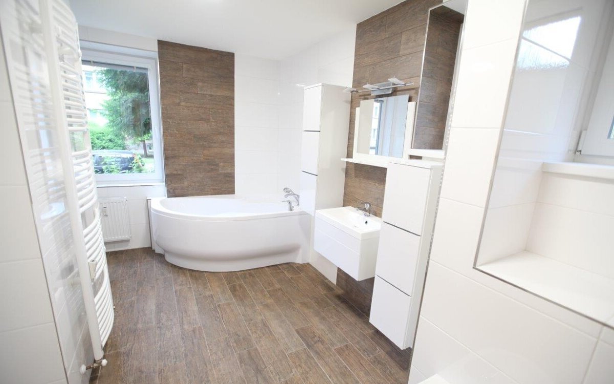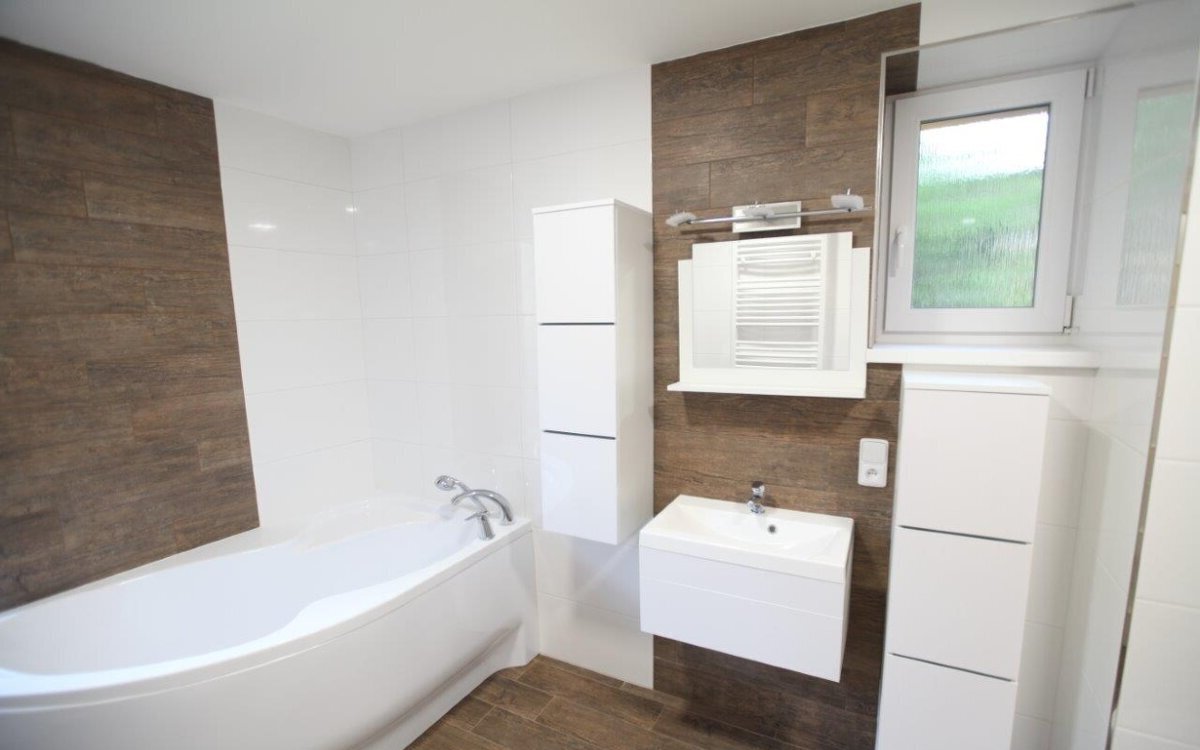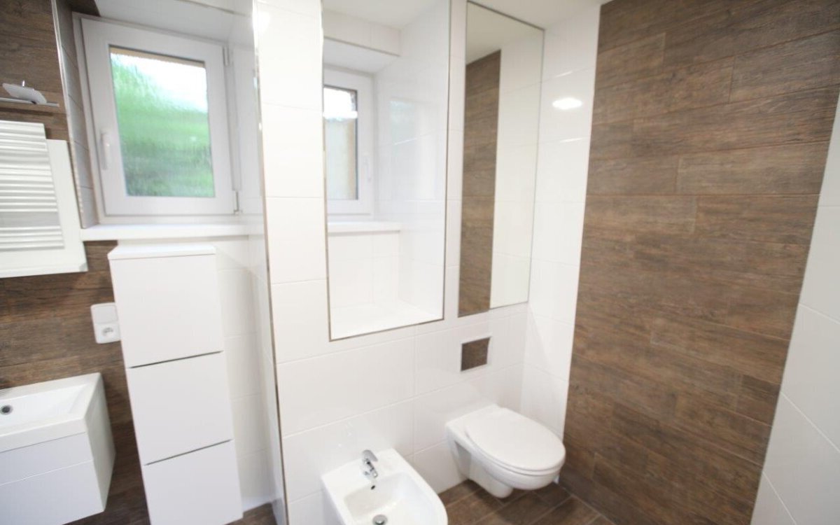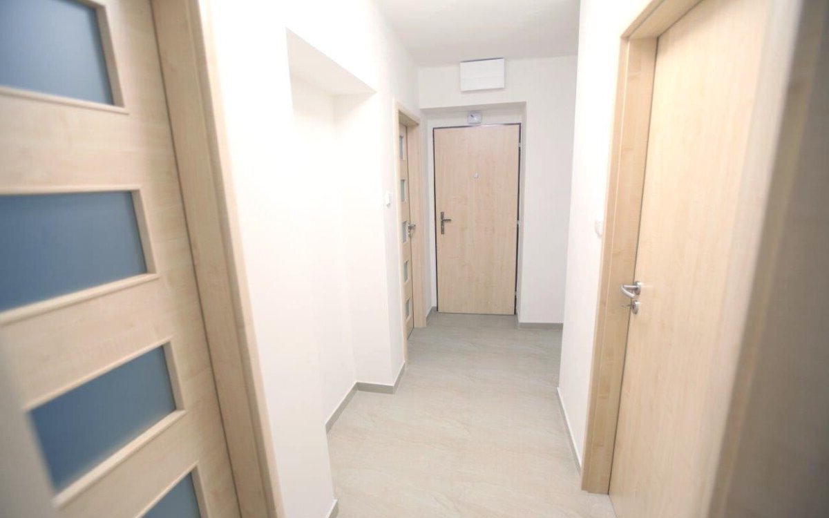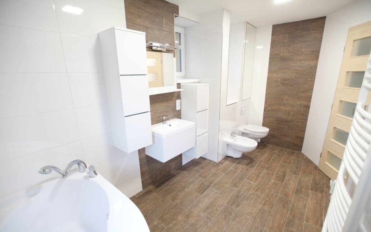 střední topení s novými radiátory je napojeno na dálkové vytápění, ohřev teplé vody zajišťuje vlastní boiler na noční proud. Velká koupelna s novými bílými obklady a dlažbou v dekoru tropického dřeva: rohová vana s integrovanou sprchou, závěsné WC s kvalitní mechanikou FRIATEC, bidet a místo na pračku 60×60 i sušičku. Kuchyň v nadstandardním provedení (tlumené dojezdy, výsuvy s dotahem) s možností doplnit myčku. Pracovní deska KAINDL v dekoru dřeva, granitový dřez s odkapávačem. Vestavěné spotřebiče WHIRLPOOL: nerez horkovzdušná trouba s grilem, sklokeramická varná deska nové generace s dětskou pojistkou a nerez digestoř s osvětlením. Vše včetně návodů. Nové štuky, interiérové dveře SOLODOOR a dřevěné obložky (světlý javor), vstupní protipožární dveře s bezpečnostním kováním, plastová okna a žaluzie. V pokojích nové švýcarské plovoucí podlahy pro vyšší zátěž, v chodbě a kuchyni moderní velkoformátová dlažba. Kompletně nová elektroinstalace s proudovým chráničem a jističi; všechna svítidla v LED koncepci; zásuvky a vypínače ABB TANGO. K bytu patří sklep 5 m² s oknem.