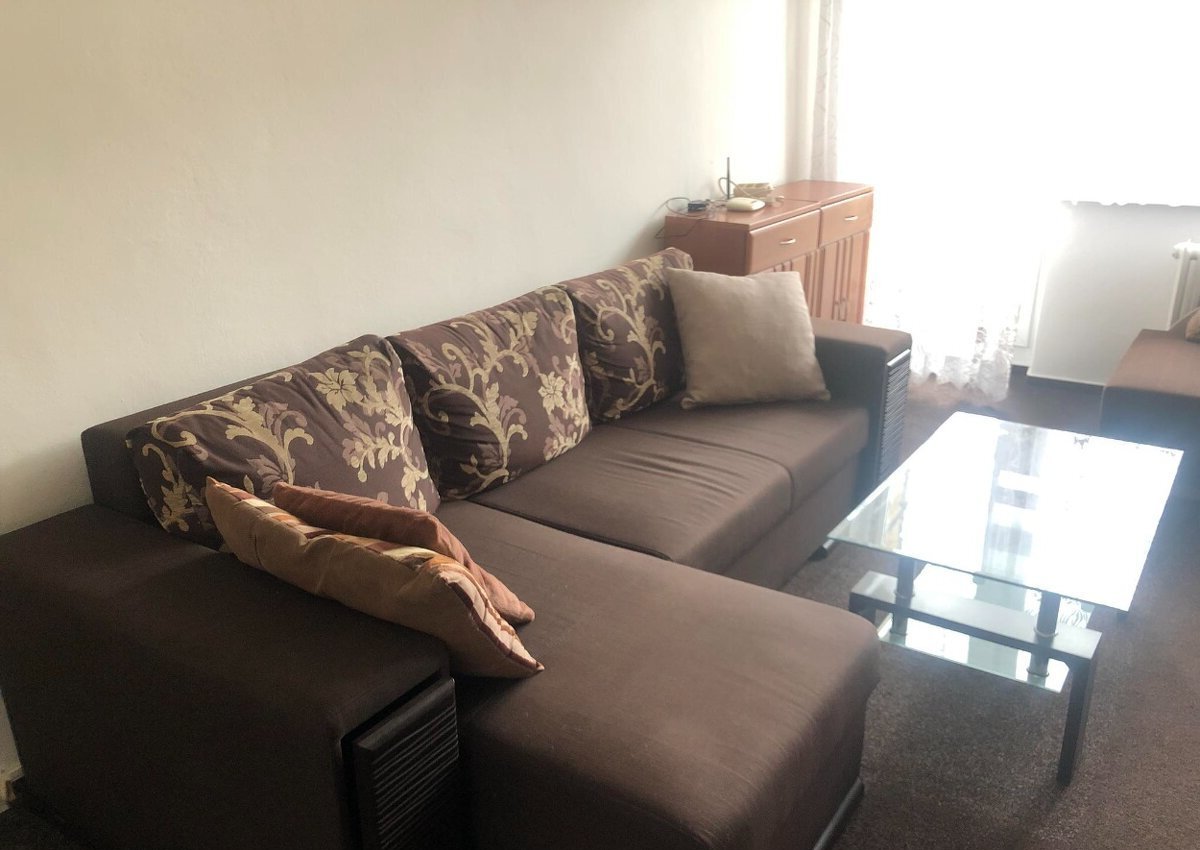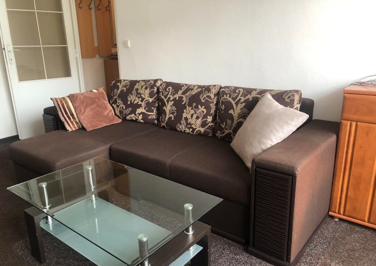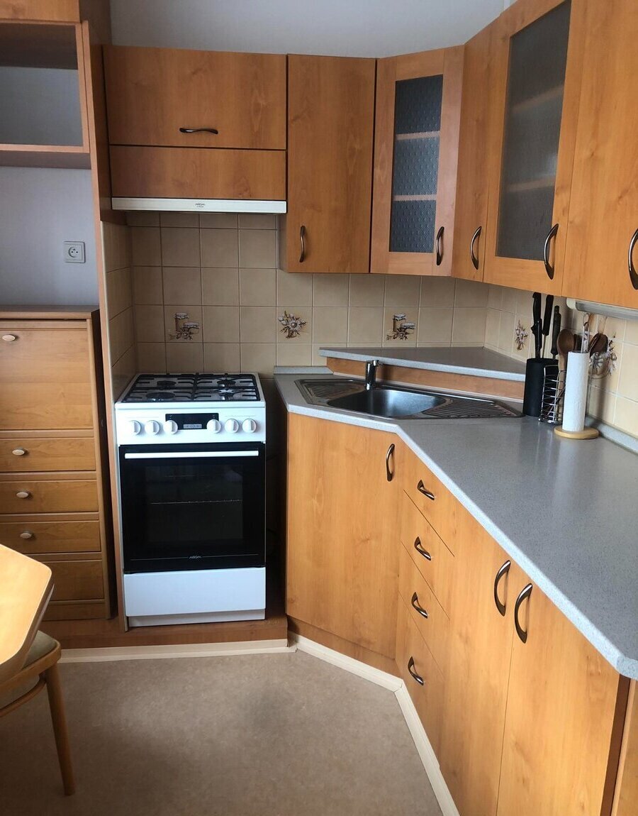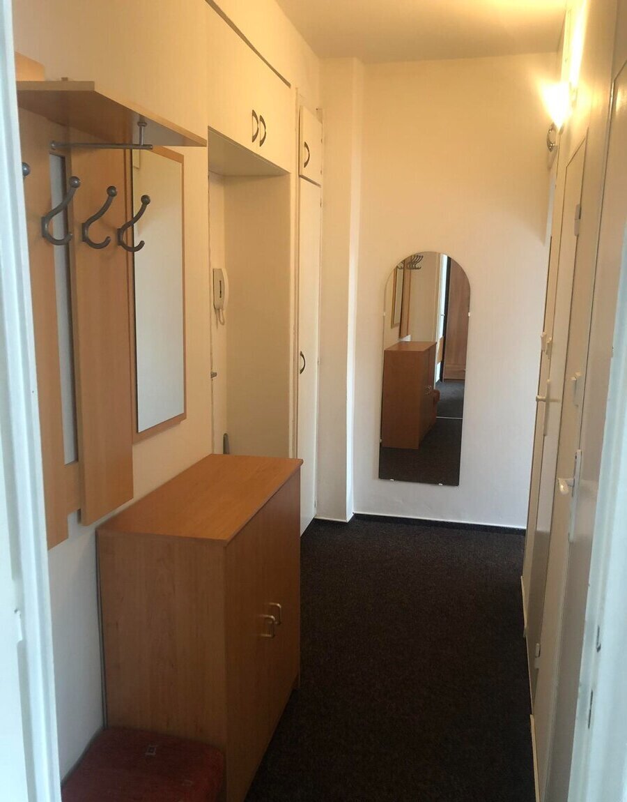 Byt je téměř kompletně zařízený (viz foto); chybí jen obývací stěna. K dispozici je kuchyňská linka, sporák, lednice, stůl se židlemi, pračka se sušičkou, sprchový kout, umyvadlo se skříňkou, zrcadlová skříňka, koupelnová skříň s úložným prostorem, botníková stěna, sedací souprava a konferenční stolek. Po dohodě je možné použít vlastní nábytek.