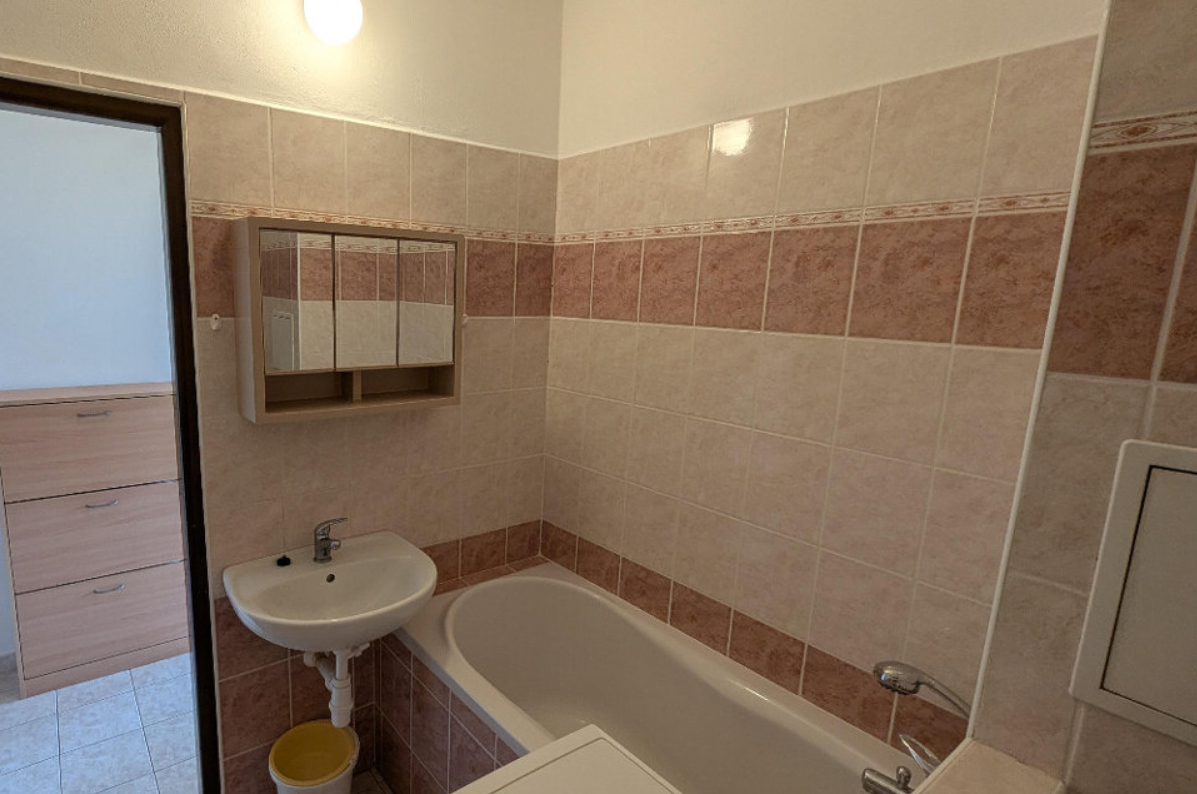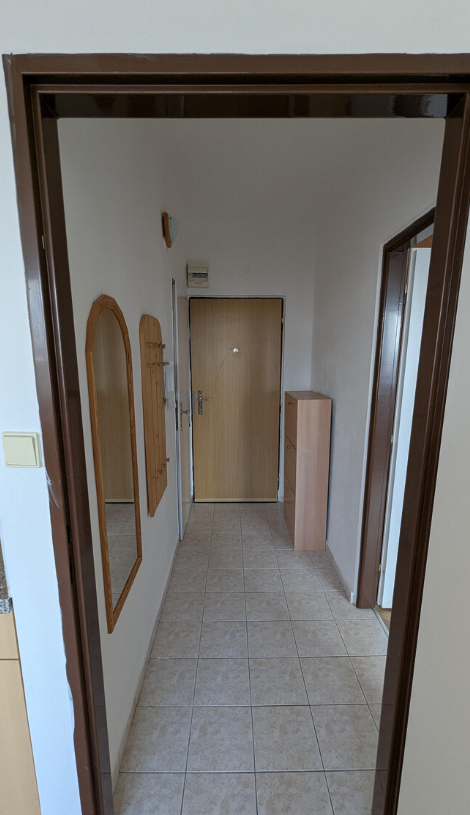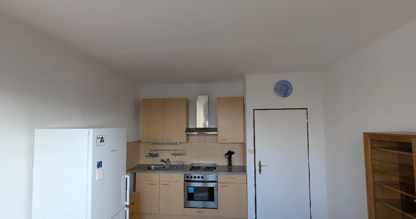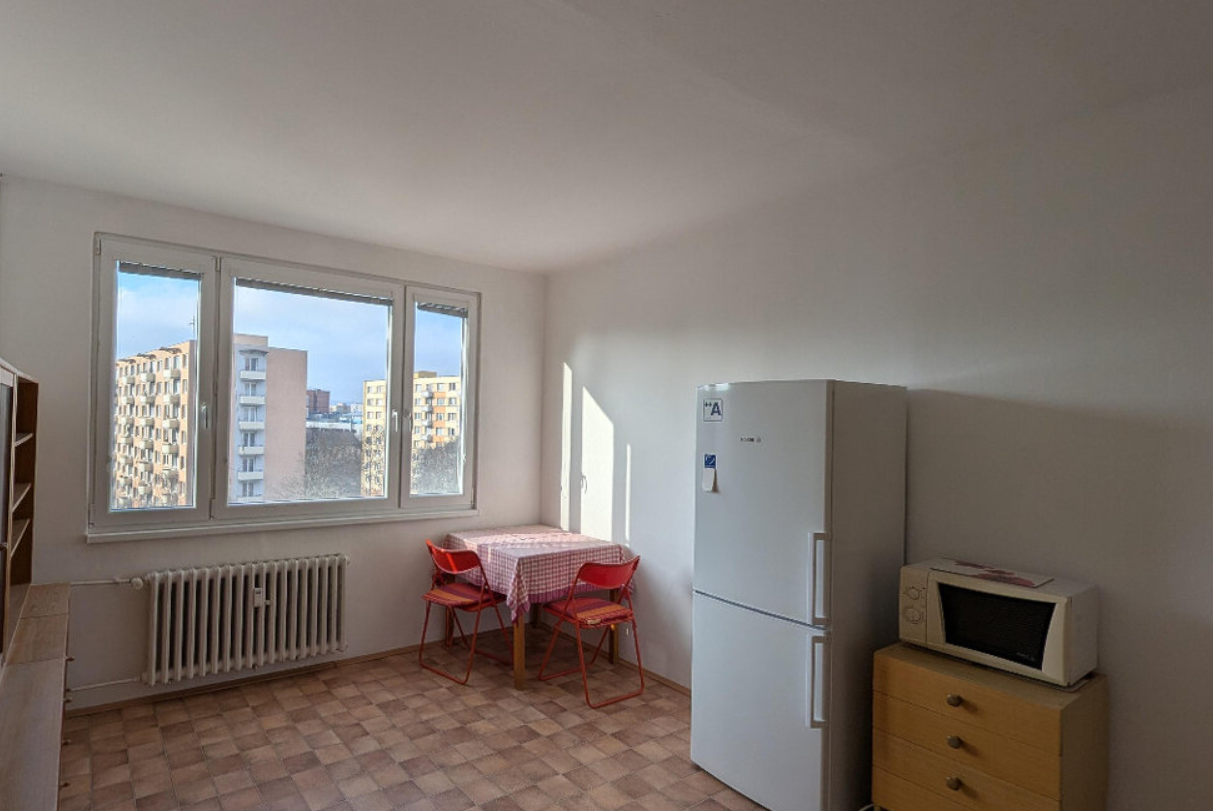 Dispozice bytu zahrnuje zádveří, koupelnu s toaletou, kuchyni a obývací pokoj. K dispozici je kuchyňská linka s vestavěnými spotřebiči, mikrovlnná trouba, pračka, televizor a lednice s mrazákem. S vážným zájemcem je možná domluva na odvozu nábytku, který je zachycen na fotografiích.