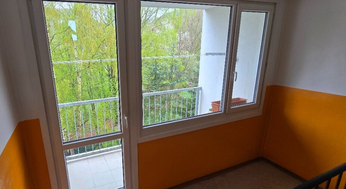 Byt je situován v panelovém domě s výtahem ve třetím patře a k dispozici je také balkon v mezipatře.