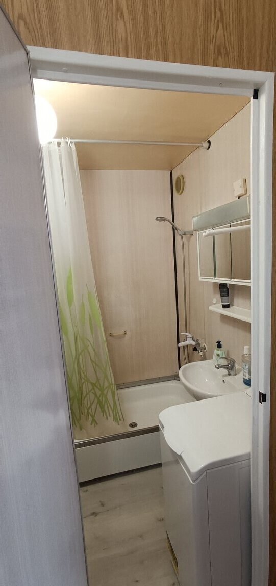 Dispozice: pokoj s kuchyňským koutem, koupelna se sprchou a WC, předsíň a úložná místnost.