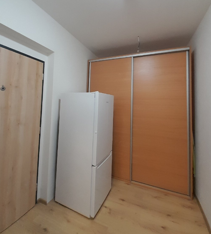 Byt je orientován na východní stranu a má lodžii. Dispozice zahrnuje vstupní chodbu se šatní skříní, koupelnu s vanou, WC a pračkou a obývací pokoj s kuchyňským koutem a vstupem na lodžii. Kuchyňská linka je vybavena vestavěnými spotřebiči – myčkou, troubou, mikrovlnnou troubou a indukční varnou deskou. Na oknech jsou instalovány žaluzie a sítě proti hmyzu.