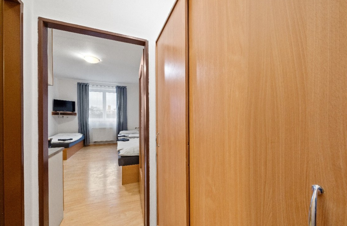 Dispozice bytu zahrnuje obytnou místnost s kuchyňským koutem, chodbu a koupelnu se sprchovým koutem a toaletou. Součástí pronájmu je kompletní vybavení dle fotografií, konkrétně postele včetně matrací a ložního prádla, jídelní stůl se židlemi, lednice s mrazákem, mikrovlnná trouba, rychlovarná konvice, varná deska, televize a šatní skříň.