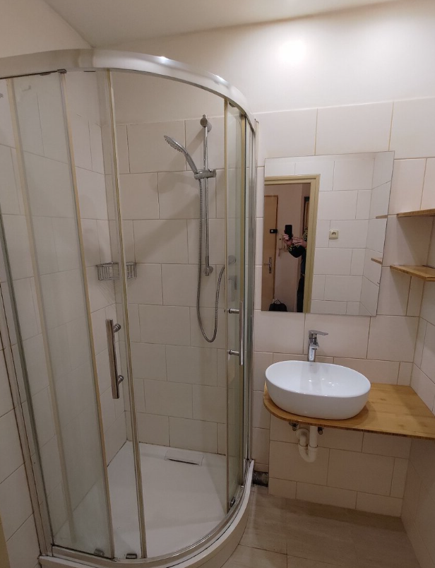 Koupelna má sprchový kout. Pozor, prostor pro pračku je úzký - pouze na horem plněnou pračku. Pračku mohu do bytu dodat. WC je oddělené.