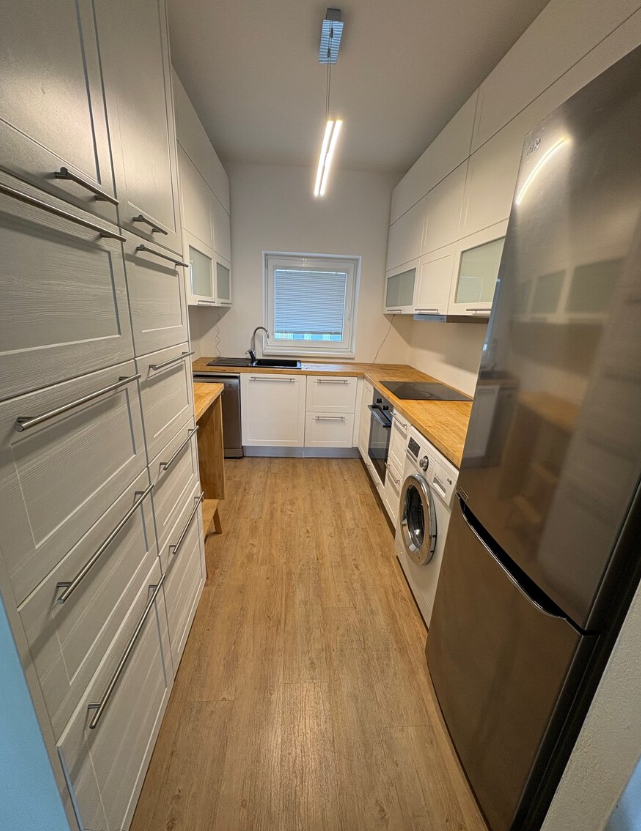 Součástí bytu je moderní kuchyně vybavená spotřebiči, jako je lednice s mrazákem, pračka a myčka. Byt nabízí dvě samostatné a prostorné místnosti. K dispozici je částečné vybavení – jídelní stůl se židlemi, konferenční stolek, TV stolek a skříň či knihovna. Nechybí ani vestavěné skříně na chodbě i v jednom z pokojů. Podlahy jsou vinylové, samozřejmostí je TV přípojka a připojení k internetu.