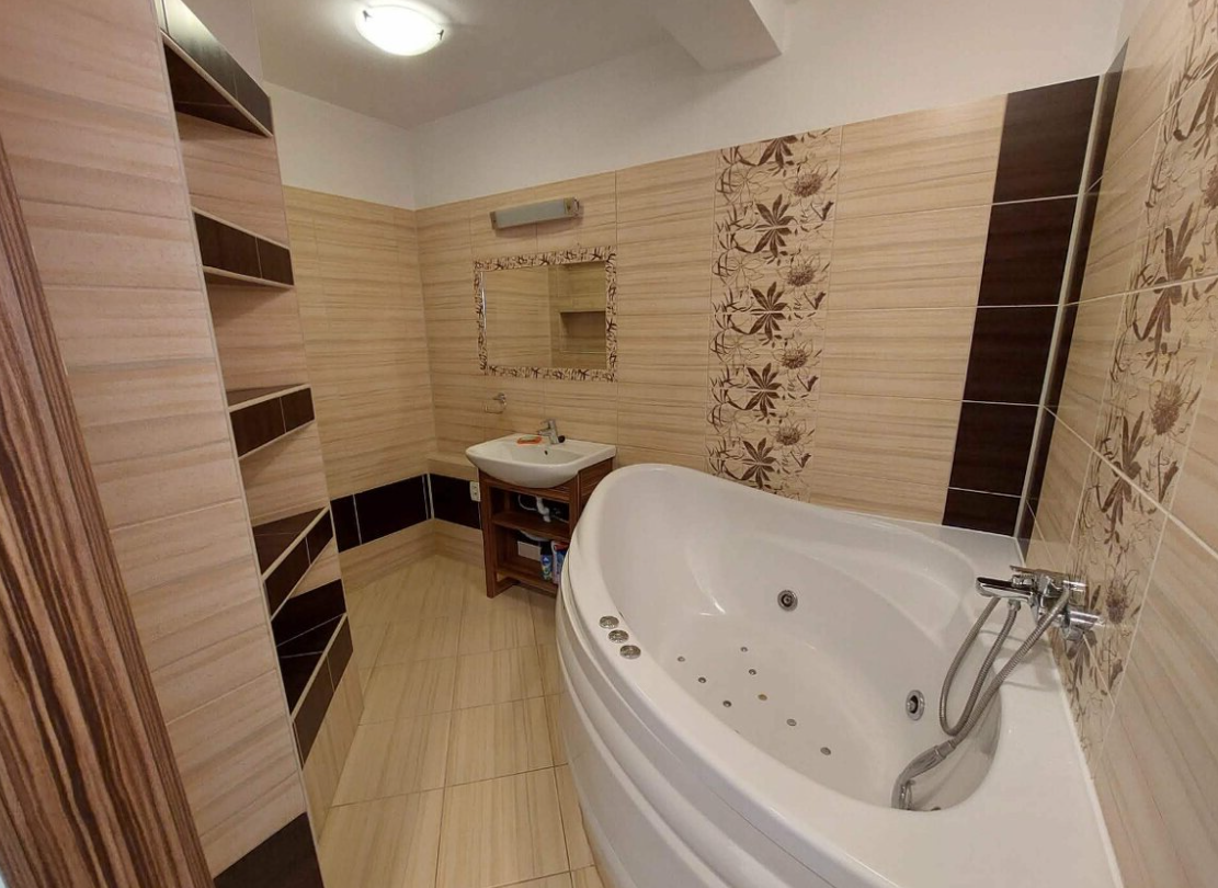 Byt prošel atypickou rekonstrukcí, která zahrnuje rohovou kuchyňskou linku, prostornou koupelnu s vířivou vanou a sádrokartonové podhledy, ty dotvářejí moderní vzhled interiéru.