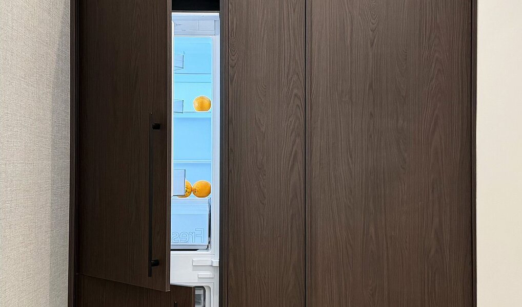 Dispozice 2+kk je řešena velmi efektivně – prostorný obývací pokoj plynule navazuje na kuchyň se zaoblenými liniemi. Kuchyň je plně vybavena spotřebiči Siemens (trouba, velká lednice, zapuštěná indukční deska, myčka, digestoř).