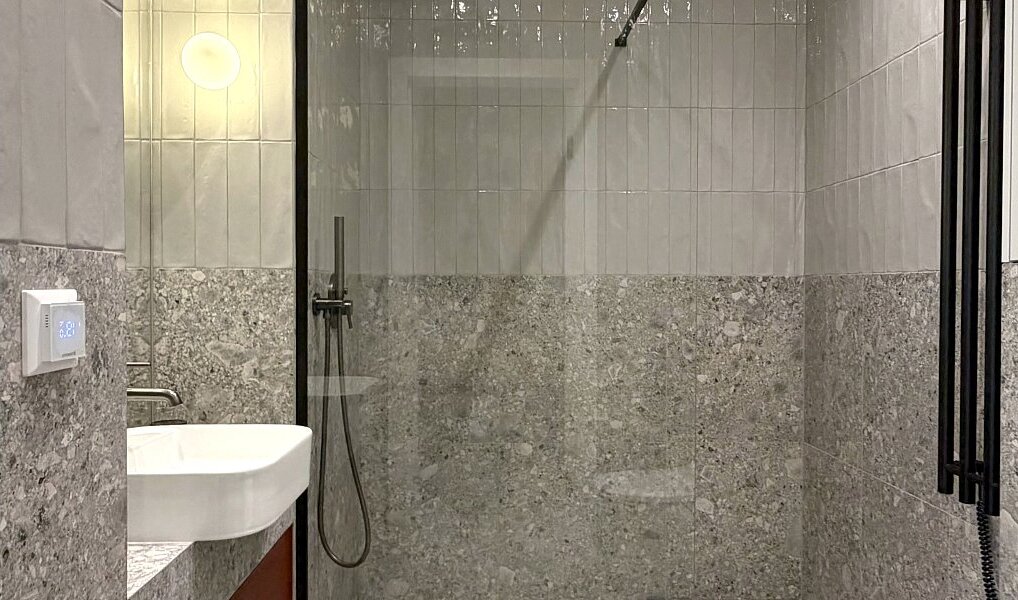 Technický standard: klimatizace, nový úsporný plynový kondenzační kotel a podlahové vytápění v koupelně.