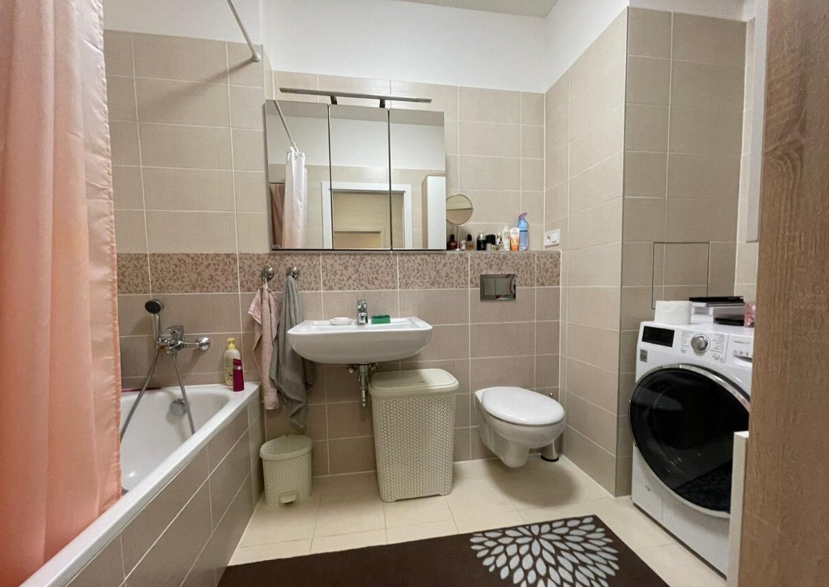 Koupelna je s vanou a toaletou, k dispozici je také pračka. V předsíni se nacházejí praktické úložné prostory. Součástí pronájmu je sklep pro další uskladnění věcí.