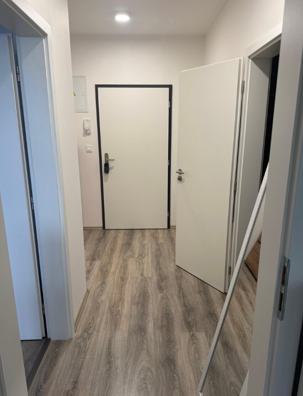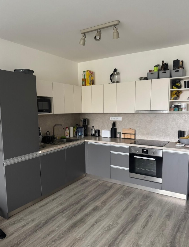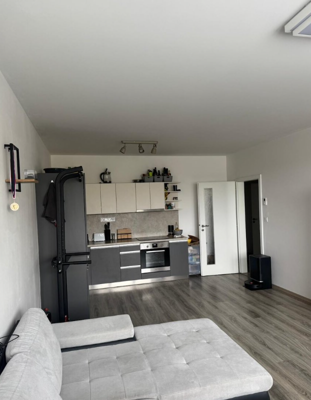 Dispozice bytu je vyobrazena v rámci fotodokumentace inzerátu – obývací pokoj s moderním kuchyňským koutem na míru, ložnice, prostorná lodžie, šatna v komoře, chodba, koupelna s vanou a samostatná místnost s toaletou. Kuchyňský kout včetně osvětlení pracovní desky je vybaven spotřebiči - vestavěná chladnička s mrazničkou, trouba, sklokeramická deska, odsavač par, včetně vestavěné myčky nádobí. K bytu náleží sklep v přízemí domu. Byt je nabízen bez nábytku.
