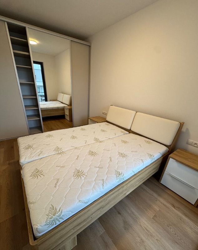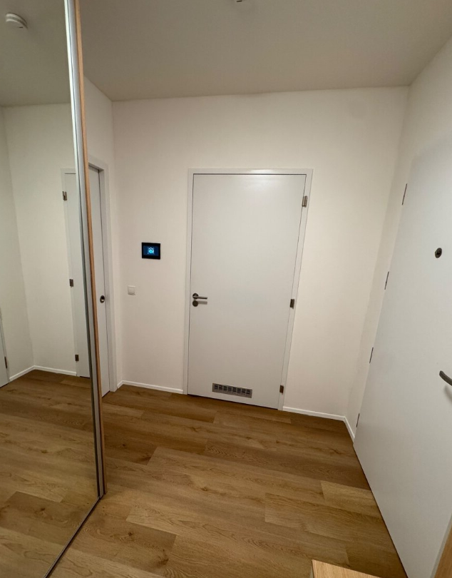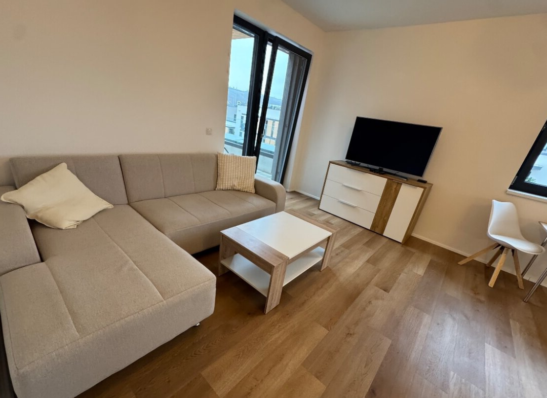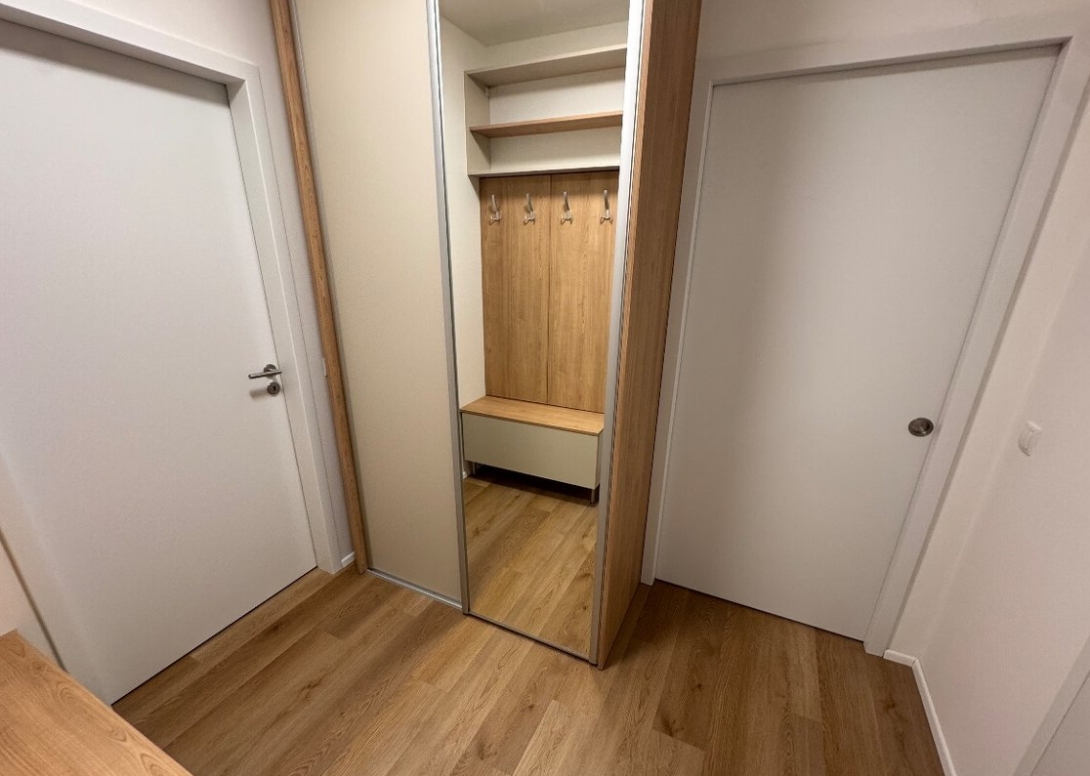 Bezbariérový byt je umístěn v 6. nadzemním podlaží domu se dvěma výtahy. Dispozice zahrnuje prostornou koupelnu se sprchovým koutem, pračkou a sušičkou, dále obývací pokoj s televizí, klimatizací a částečně vybavenou kuchyňskou linkou a samostatnou ložnici se vstupem na balkon. Balkon je přístupný také z obývacího pokoje a nabízí výhled do zeleně. Ve všech oknech jsou instalovány elektrické zatemňovací rolety.