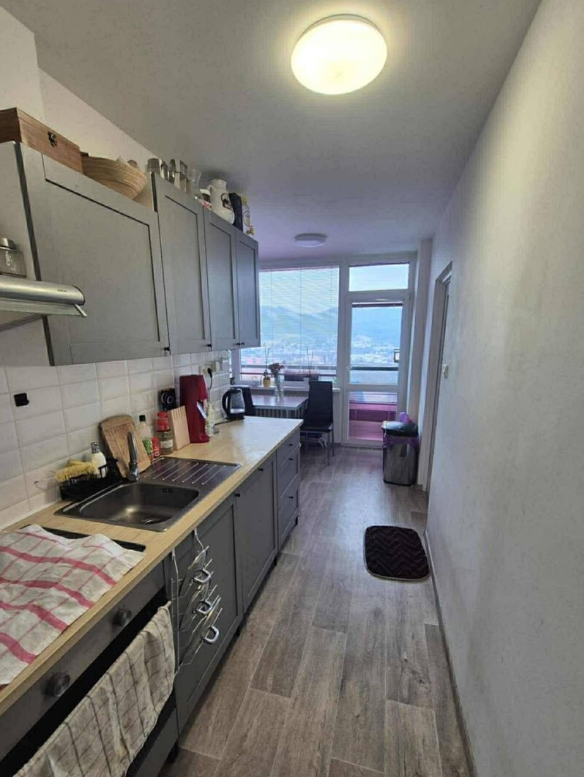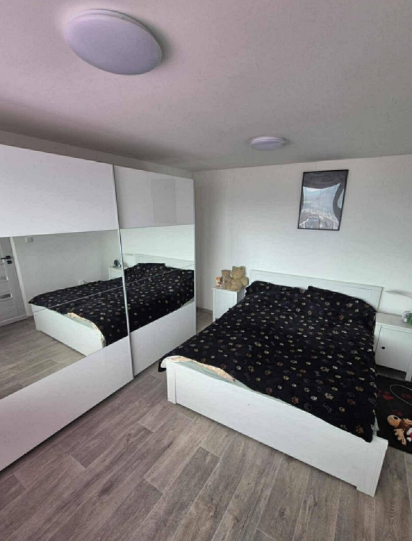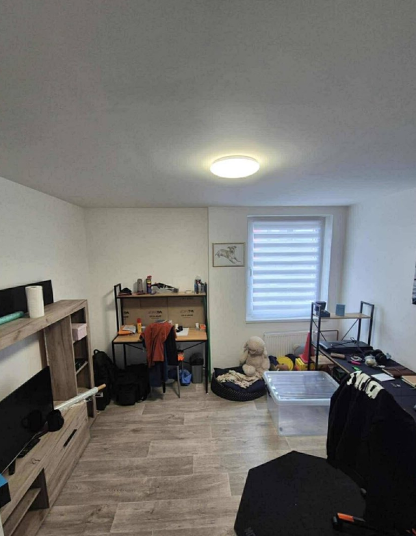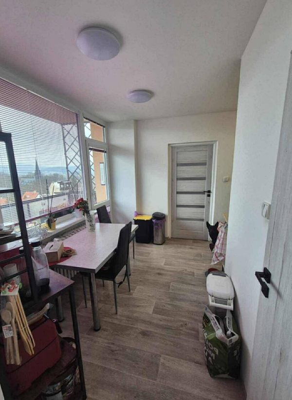 Dispozice bytu tvoří delší vstupní chodba, ze které je přístup do technické místnosti, na samostatné WC a do menšího pokoje. Dále navazuje kuchyně s jídelním koutem a vstupem na balkon, vybavená šedou kuchyňskou linkou z Ikea starou přibližně 3 roky. Z kuchyně se vstupuje do většího pokoje vhodného jako ložnice či dětský pokoj a také do obývacího pokoje. Z obývacího pokoje vedou širší posuvné dveře na chodbu, což usnadňuje manipulaci při stěhování. Koupelna je vybavena vanou a běžným příslušenstvím. K bytu náleží také sklepní prostor.