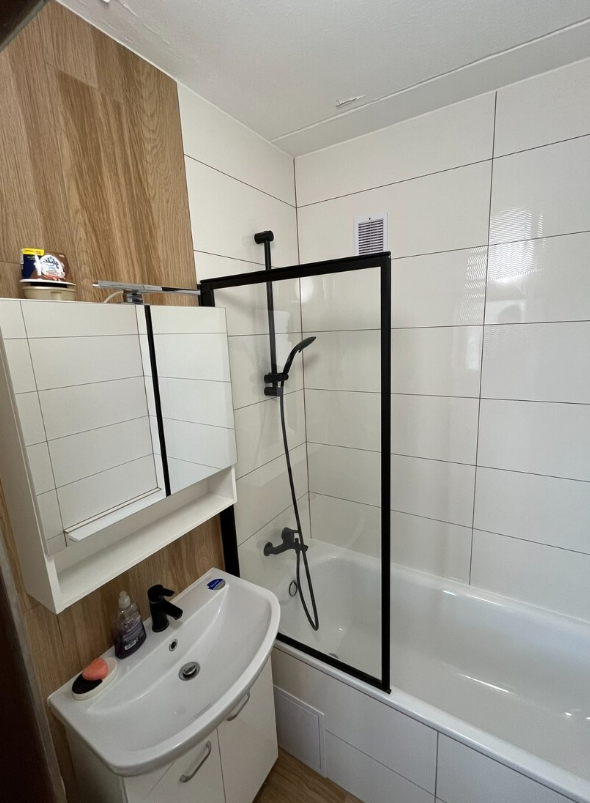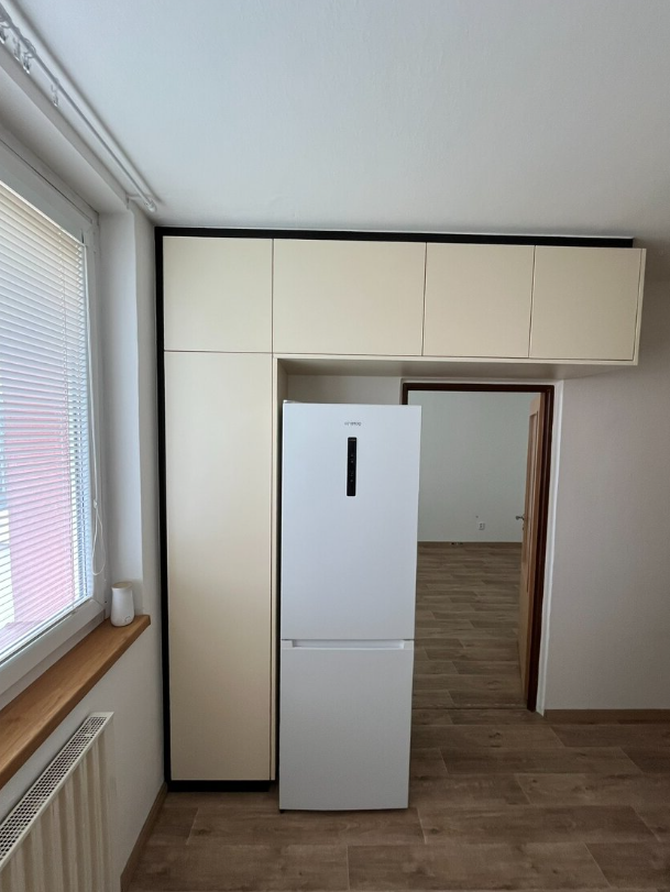 Součástí vybavení je kuchyňská linka a lednice jako na fotografiích. Koupelna je po rekonstrukci a nabízí modernější provedení.