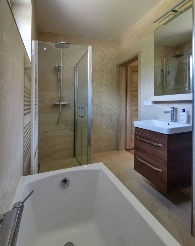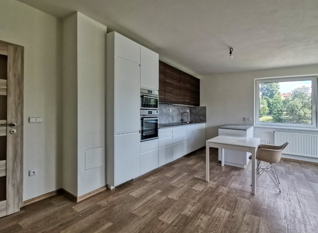 Součástí bytu je kompletně vybavená kuchyň, koupelna disponuje vanou i sprchovým koutem a toaleta je samostatná.