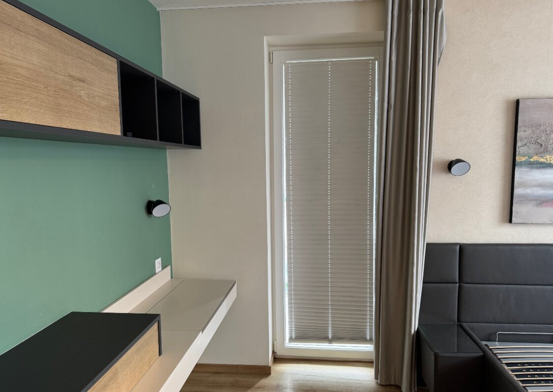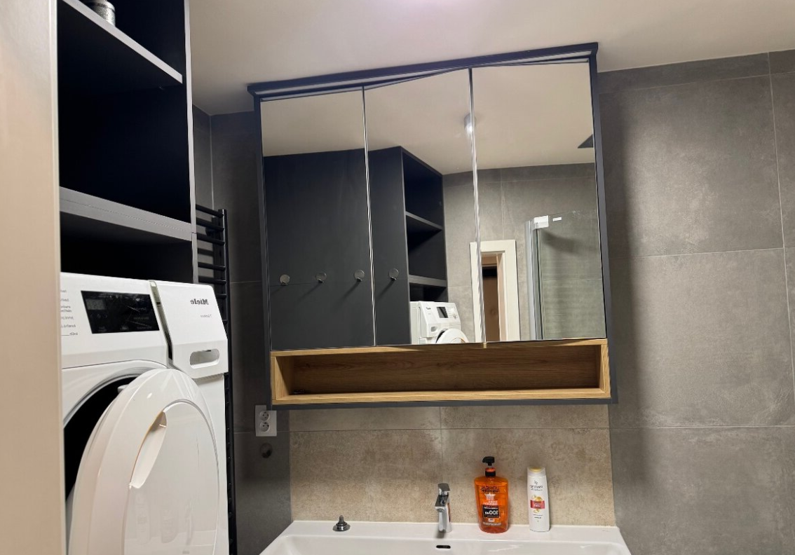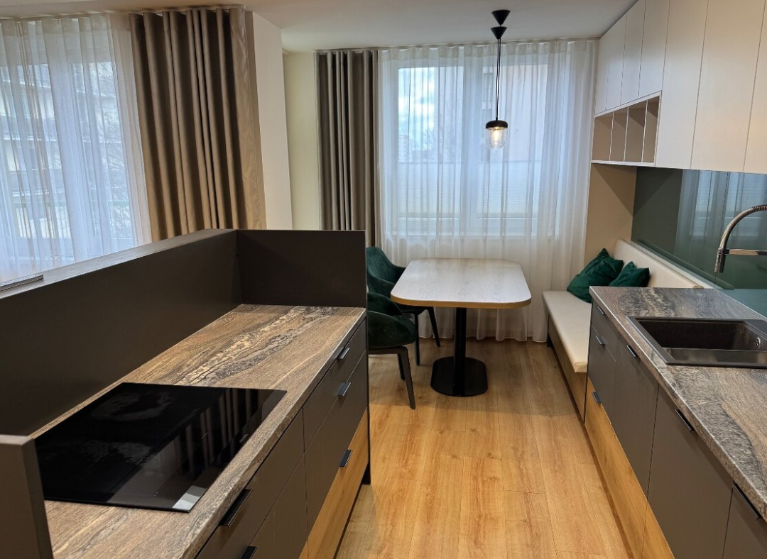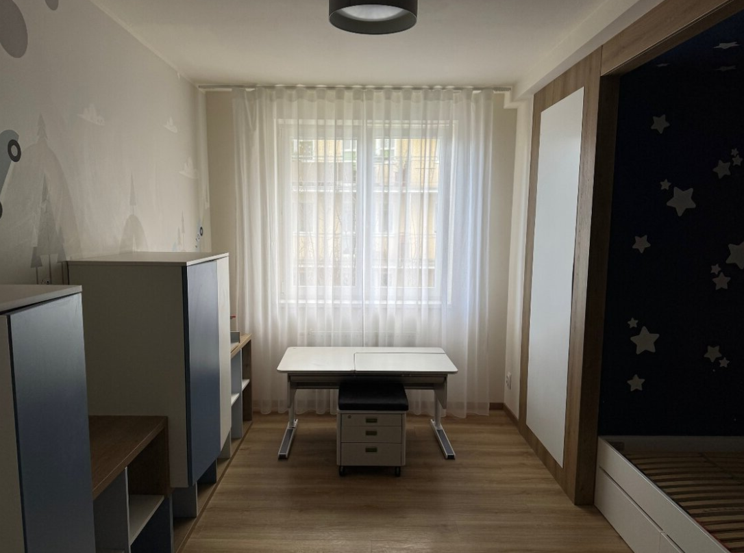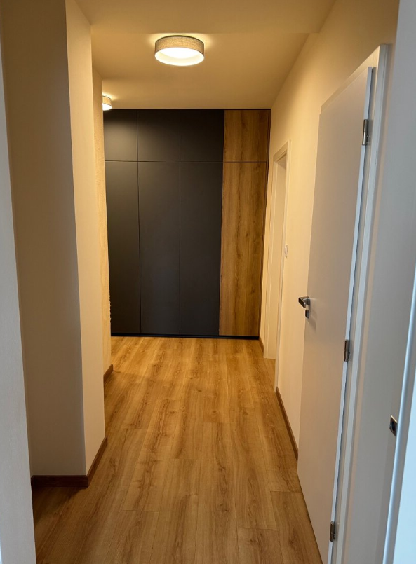 Dispozice zahrnuje obývací pokoj se vstupem na balkon, ložnici se vstupem na balkon, dětský pokoj, jídelnu s kuchyňským koutem, koupelnu s pračkou a sušičkou, samostatné WC, komoru a předsíň. Kuchyňská linka je vybavena vestavnými spotřebiči – indukční varnou deskou, elektrickou troubou, myčkou, digestoří, lednicí a mrazákem. Součástí vybavení jsou také šatní skříně v předsíni a policový systém v komoře.
