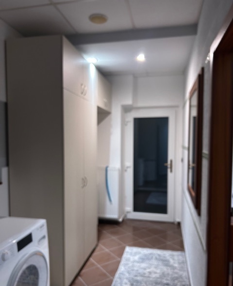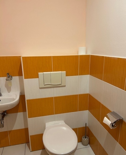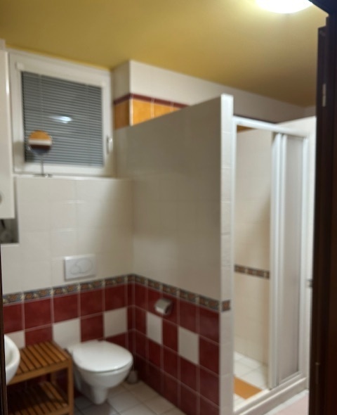 Předsíň s vestavěnou skříní, 2× WC, sprchový kout, ložnice s manželskou postelí. Nová kuchyňská linka s lednicí, sporákem a keramickou varnou deskou.
