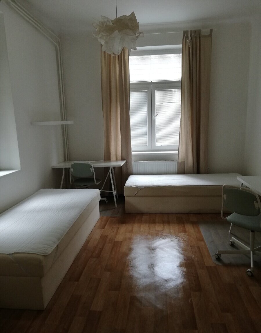 K pronájmu je prostorný pokoj pro dvě osoby v třípatrovém cihlovém domě. Pokoj se nachází ve zvýšeném přízemí a je orientován do klidné ulice. K užívání je společná kuchyň a koupelna sdílená ještě se dvěma pokoji na patře. Vhodné pro studenty.