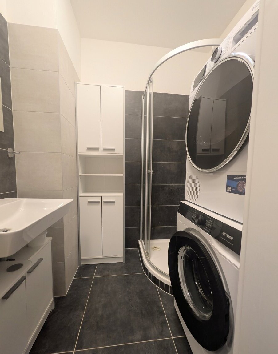Koupelnu se sprchovým koutem, pračkou a sušičkou.