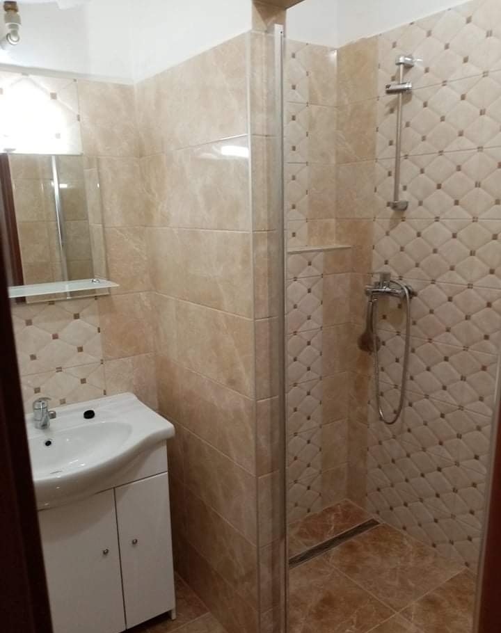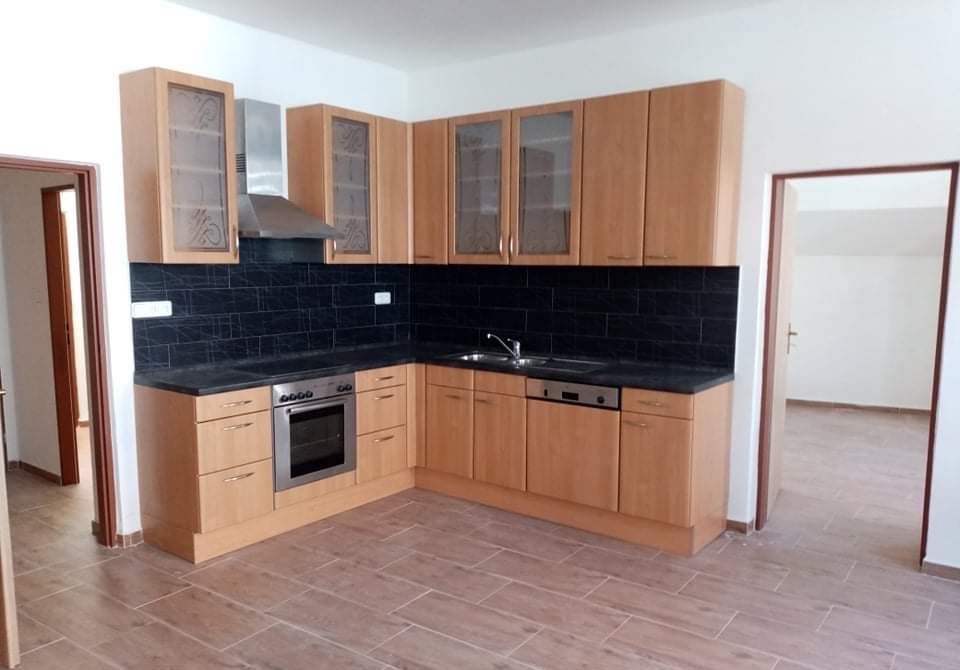 Byt je v prvním patře. Zahrnuje vstupní chodbu, velkou kuchyň se spotřebiči (sporák, myčka, lednice), dvě obytné místnosti, koupelnu se sprchovým koutem a samostatné WC.